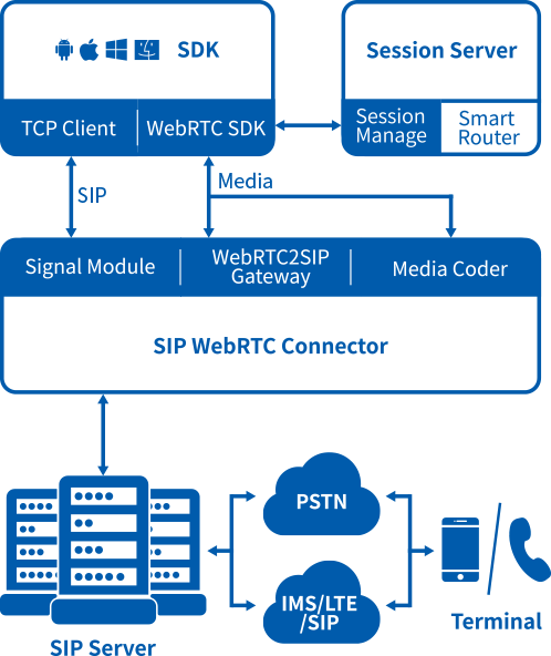 自研SDK+SIP2WebRTC/WebRTC2SIP Gateway网关,针对SIP/VoIP语音通话做了深度优化,部署大量边缘服务器,提供就近加速